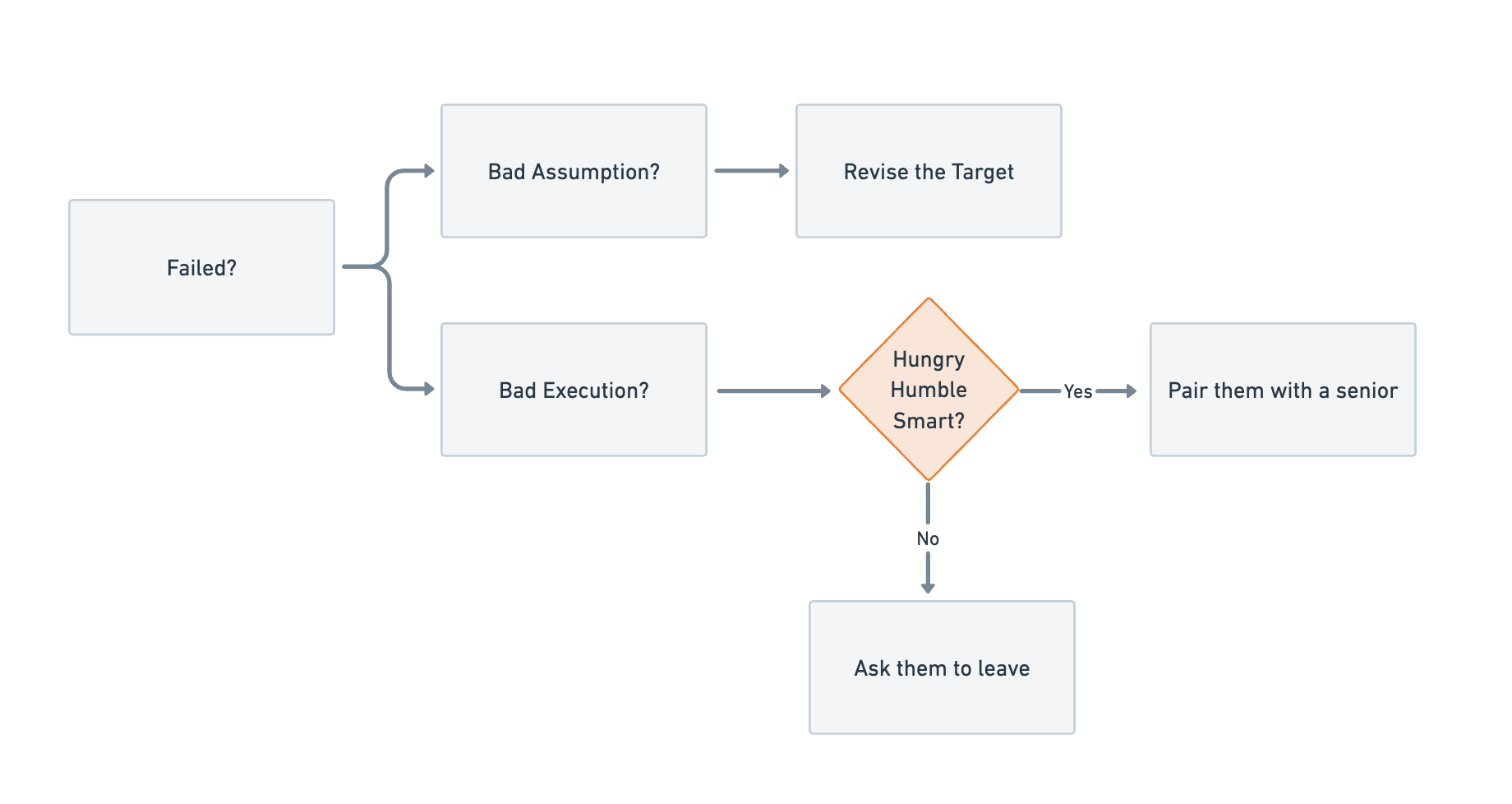 However, if you realize they lack the qualities of being hungry, humble, and smart, you need to stop wasting your time, their time, and the company’s money, and ask them to leave the team.